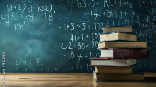 Stack of Books in Front of Chalkboard with Equations