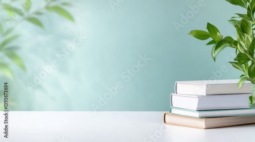 Stack of books on a white table, soft green background, natural light, peaceful study space