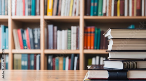 Stack of books on wooden table and blurred bookshelf in library room, education,