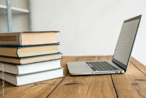 Stack of books on wooden table with laptop, computer storage, laptop keyboard, desk accessories, home office furniture