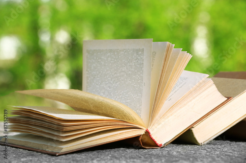 Stack of books outdoors, on blurred background