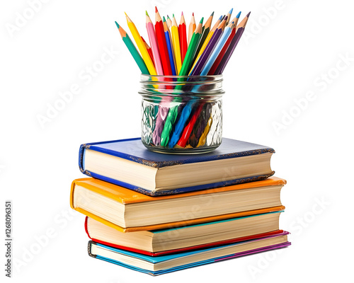 Stack of books with a jar of colorful pencils on top, representing education and learning,