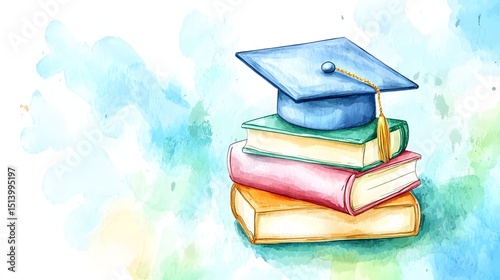 Stack of books with graduation cap in watercolor style.