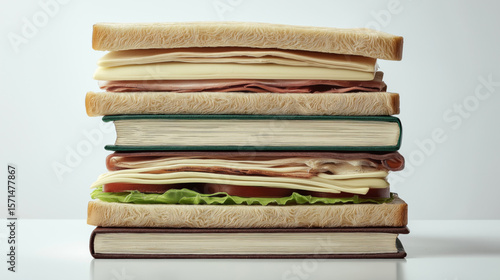 Stack of books with sandwiches on top, layered with ingredients, healthy lunch, culinary art, food obsession, gourmet, fresh, healthy snack, dietary, balanced diet, edibles, lifestyle