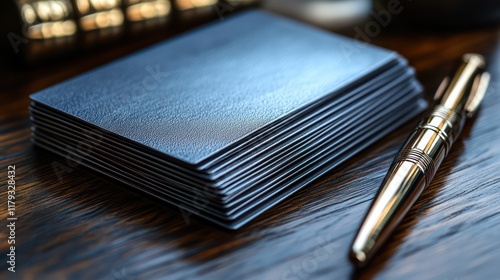 Stack of Business Cards and a Gold Pen on a Wooden Desk