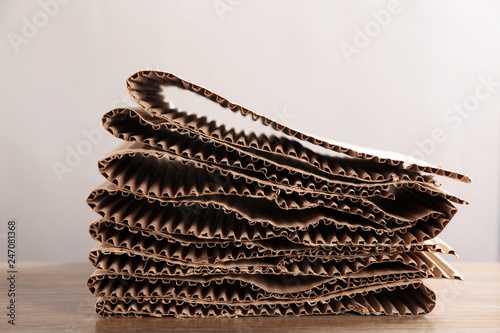 Stack of cardboard on table against light background, closeup. Recycling concept