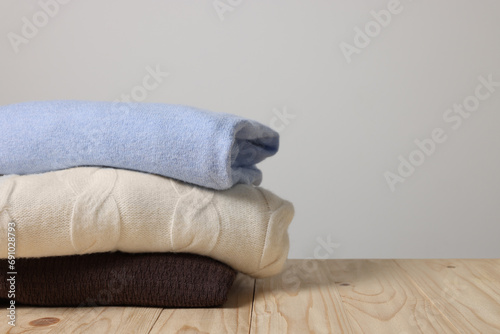 Stack of casual sweaters on wooden table against light grey background. Space for text