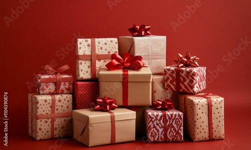 Stack of Christmas gift boxes. Heap of wrapped present boxes with bows. Composition with copy space. Christmas present,