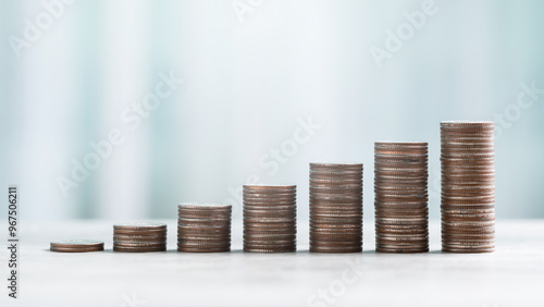 Stack of coins are neatly arranged on a table against a bright white background. The image represents the concept of saving money for the future.