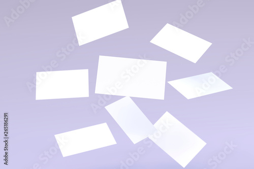 Stack of falling blank white business cards mock-up on purple background. 3D Render Illustration of realistic mockup design.