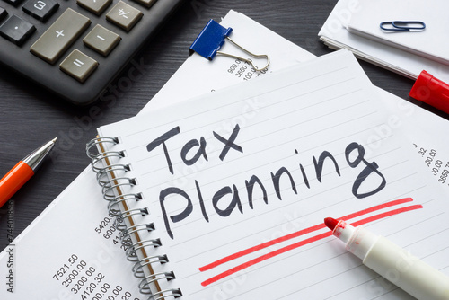 Stack of financial documents and notepad with writing tax planning.