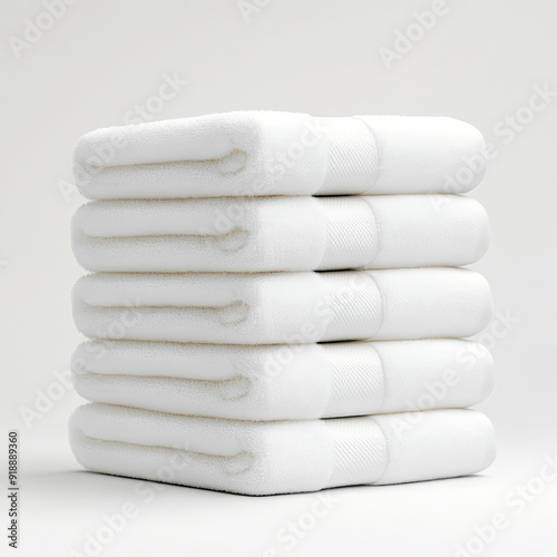 Stack of five clean, neatly folded white towels isolated on a plain background. Perfect for spa, bathroom, or hospitality themes.
