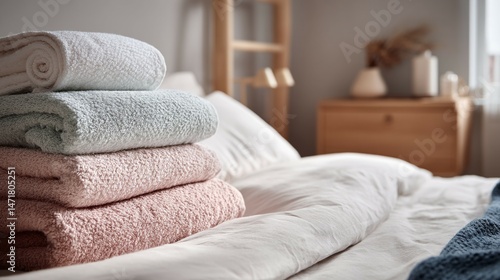 Stack of folded blankets on a bed in a bedroom with natural light.