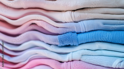 Stack of folded towels in pink white and blue pastel colors arranged vertically