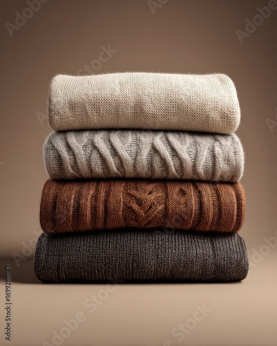 Stack of four folded knitted sweaters in earthy tones with varied textures