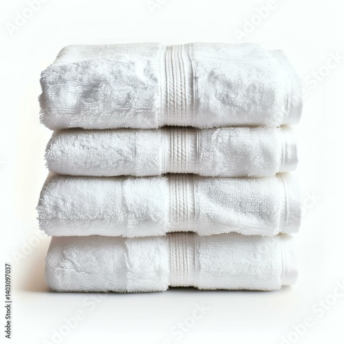 Stack of Four Folded White Bath Towels Neatly Arranged, Ready for Use in Bathroom, Spa or Hotel - Cleanliness and Comfort