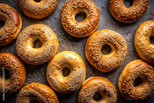 Stack of Fresh Sesame Seed Bagels on Dark Background - Gourmet Food Photography, High-Quality Bagels, Bakery Products, Artisan Bread, Delicious Snacks, Breakfast Ideas, Healthy Eating