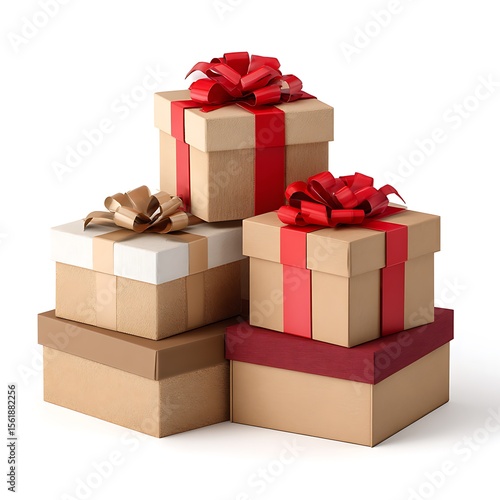 Stack of gift boxes red and gold ribbons festive holiday celebration presents 3D render kraft paper elegant modern design