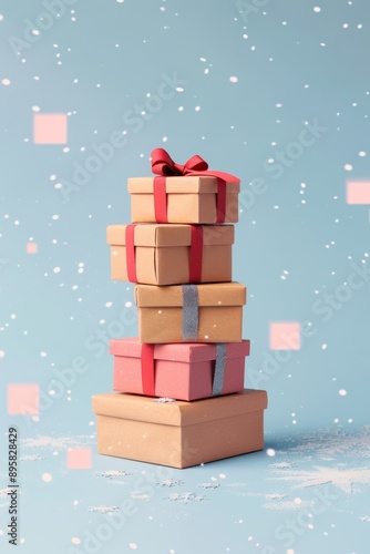 Stack of gift boxes with ribbons in the snow, set against a light blue background with falling snow.