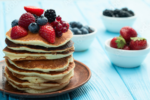 Stack of homemade american pancakes with berries . Top view
