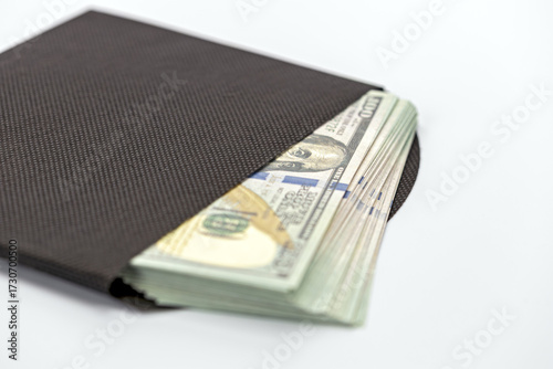 Stack of hundred dollar bills partly inside black leather wallet, close up showing cash and texture, conveying wealth and financial success with crisp banknote detail