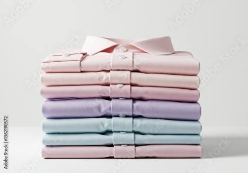 Stack of neatly folded pastel colored dress shirts on a white background in a studio setting