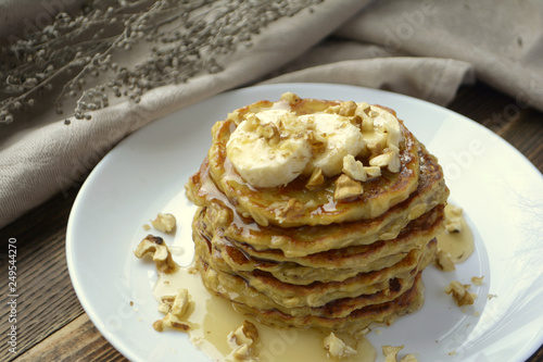 Stack of oatmeal pancake with banana, nuts and honey Healthy Breakfast