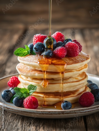 Stack of pancakes with berries and maple syrup being poured on top on a wooden surface closeup view