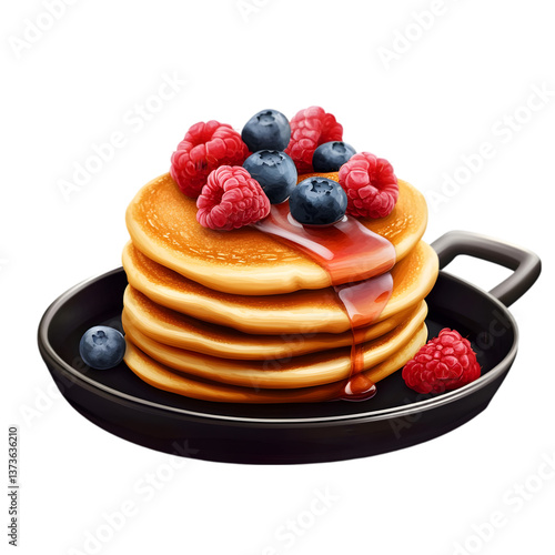 Stack of pancakes with berries and syrup in a black pan on a black background illustration