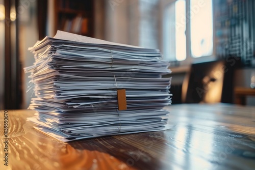 Stack of paperwork sitting on a desk with a paperclip in an office