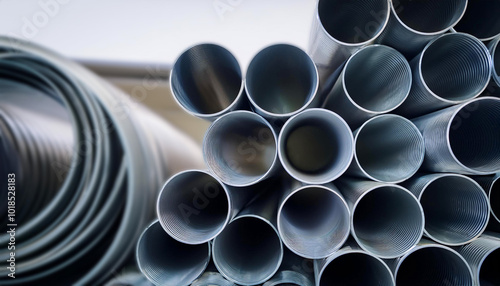 stack of pipes, stacked industrial metal pipes, arranged in an orderly manner. The pipes are captured from the open ends, arrangement and materials suggest themes of construction, manufacturing