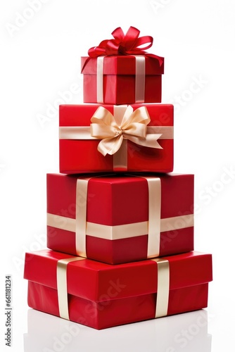 Stack of red christmas gift boxes with golden ribbons isolated on white
