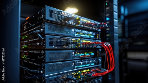 Stack of servers with blinking lights and connected red cables in a data center, showcasing technology infrastructure.