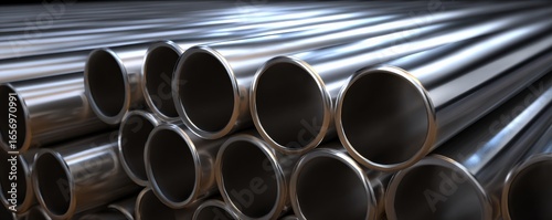 Stack of Shiny Metal Pipes Close-up Composition, Industrial Concept, 3D Render, Steel Tubes Metal pipes, industrial materials