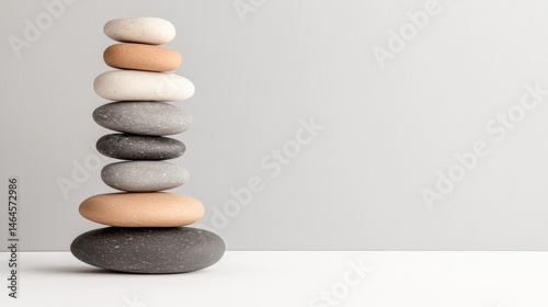 Stack of smooth rounded stones of various sizes and colors arranged in a vertical line on a light plain background with soft lighting and minimalism style