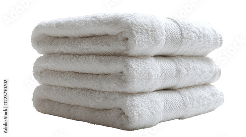 Stack of Soft Towels: Three plush, fluffy bath towels neatly stacked, showcasing their luxurious texture and absorbency. Perfect for adding a touch of comfort and cleanliness to your designs.