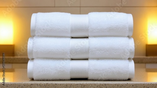 Stack of Soft White Towels in a Luxurious Bathroom Setting with Smooth Marble Surface and Warm Ambient Lighting