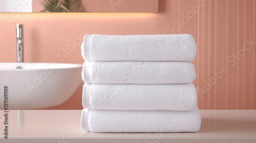 Stack of Soft White Towels on a Bathroom Counter with Minimalist Design and Modern Aesthetic in a Serene Atmosphere