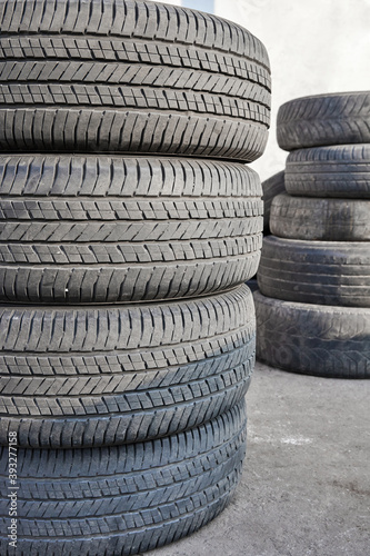 Stack of used car tires after wheel replacement