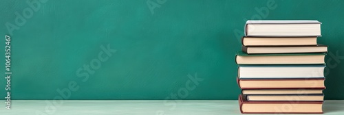 Stack of vintage books on a simple desk against a green wall, showcasing literature and study materials in a tranquil setting