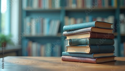Stack of vintage books rests on wooden table in library. Old volumes with worn covers suggest knowledge, learning. Blurred background shelves filled with books create atmosphere of study, education.