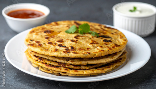 Stack of warm aloo paratha served with yogurt and chutney. Delicious Indian snack.