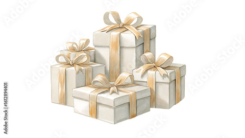 Stack of white gift boxes with gold ribbon isolated on transparent background