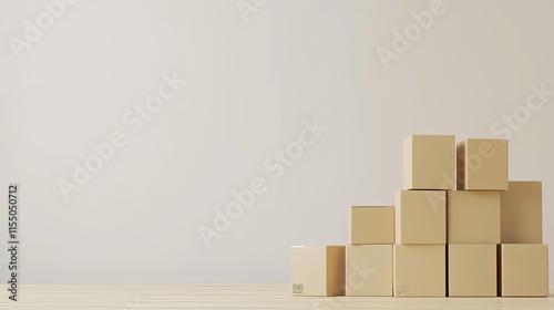 Stacked Beige Boxes on Wooden Floor Against Simple Background