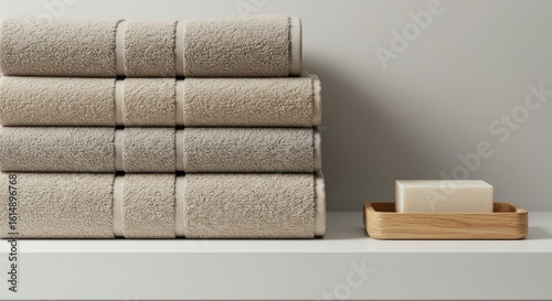 Stacked Beige Towels with Soap and Wooden Tray, Minimalist Bathroom Decor
