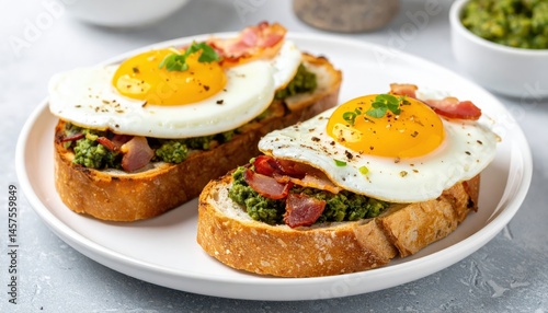Stacked breakfast sandwiches featuring fluffy fried eggs, savory bacon, and vibrant pesto rest on toasted bread on a white plate.