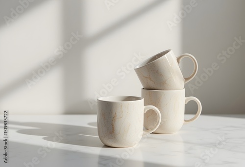 Stacked Coffee Mugs Mockup. Minimalist Table Setup. Ceramic Texture Showcase, Presenting Product Design With Simple Style. Bright Lighting Enhances Visual Appeal. Ideal For Branding.