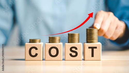 Stacked coins spelling “COST” with upward red arrow, symbolizing rising expenses.