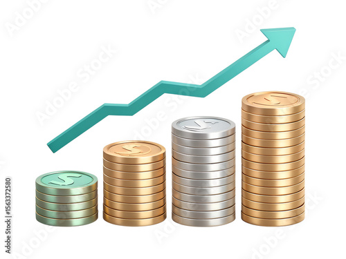 Stacked coins with rising green arrow, profit growth vector icon on transparent background, polished 3d render sticker style