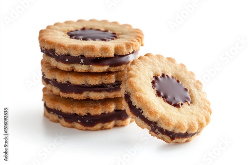 Stacked cookies with chocolate filling. A stack of round cookies, each with a chocolate filling and a scalloped edge. The filling is smooth and dark chocolate